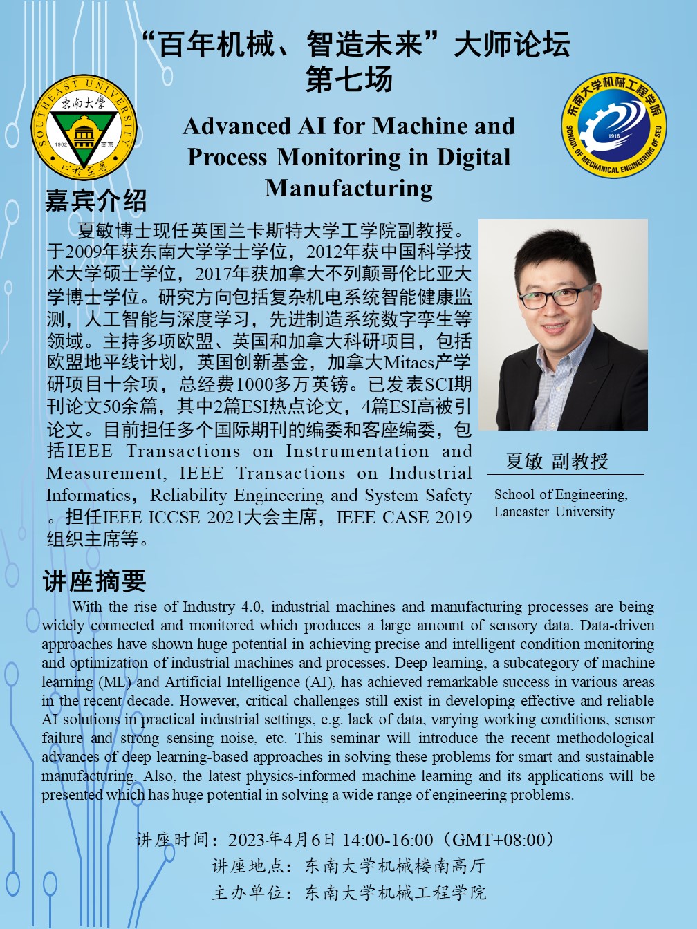 夏敏博士现任英国兰卡斯特大学工学院副教授。于2009年获必威betway中文官网学士学位,2012年获中国科学技术大学硕士学位,2017年获加拿大不列颠哥伦比亚大学博士学位。研究方向包括复杂机电系统智能健康监测,人工智能与深度学习,先进制造系统数字孪生等领域。主持多项欧盟、英国和加拿大科研项目,包括欧盟地平线计划,英国创新基金,加拿大Mitacs产学研项目十余项,总经费1000多万英镑。已发表SCI期刊论文50余篇,其中2篇ESI热点论文,4篇ESI高被引论文。目前担任多个国际期刊的编委和客座编委,包括IEEETransactions on Instrumentation and Measurement, IEEE Transactions onIndustrial Informatics,Reliability Engineering and System Safety。担任IEEE ICCSE2021大会主席,IEEE CASE 2019组织主席等。