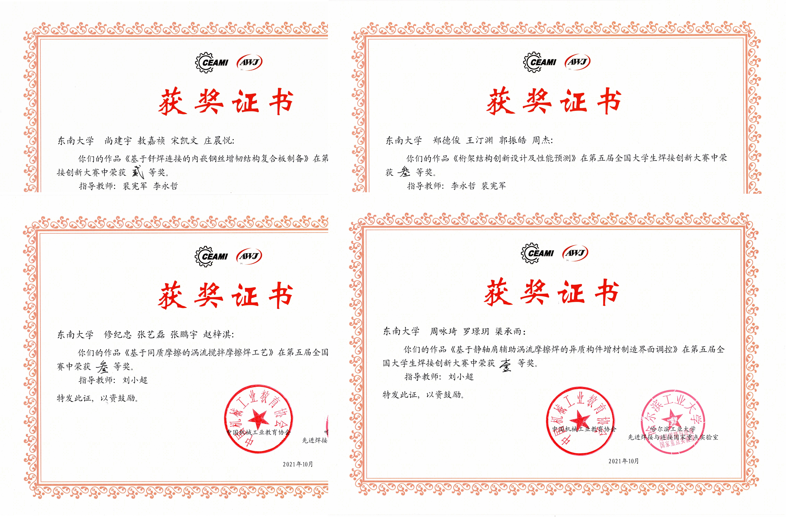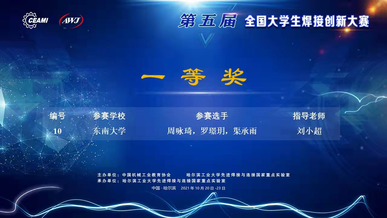 2021年10月20日-23日第五届全国大学生焊接创新大赛决赛在哈尔滨工业大学举行,本次大赛共有来自哈尔滨工业大学、清华大学、必威betway中文官网、天津大学、西北工业大学、吉林大学、中南大学等62所高校的220件作品参加决赛,我们首次组织队伍参赛,并最终获得一等奖1项、二等奖1项、三等奖2项的优异成绩。
