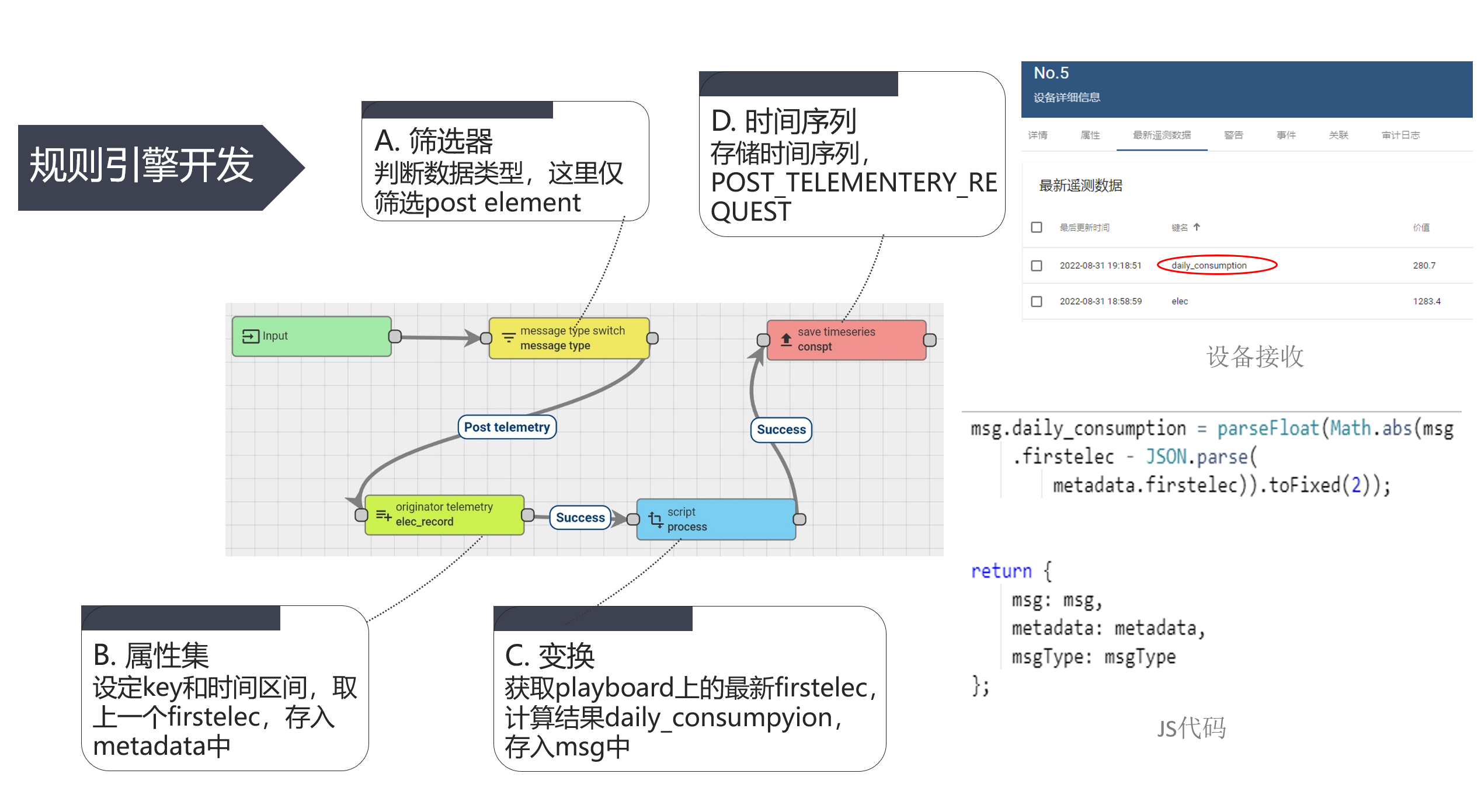 2、数据处理。通过JavaScript脚本编写、规则引擎的搭建或客户端的调用等多种手段,完成了设备用电信息的统计计算,获取设备日用电量并上传。