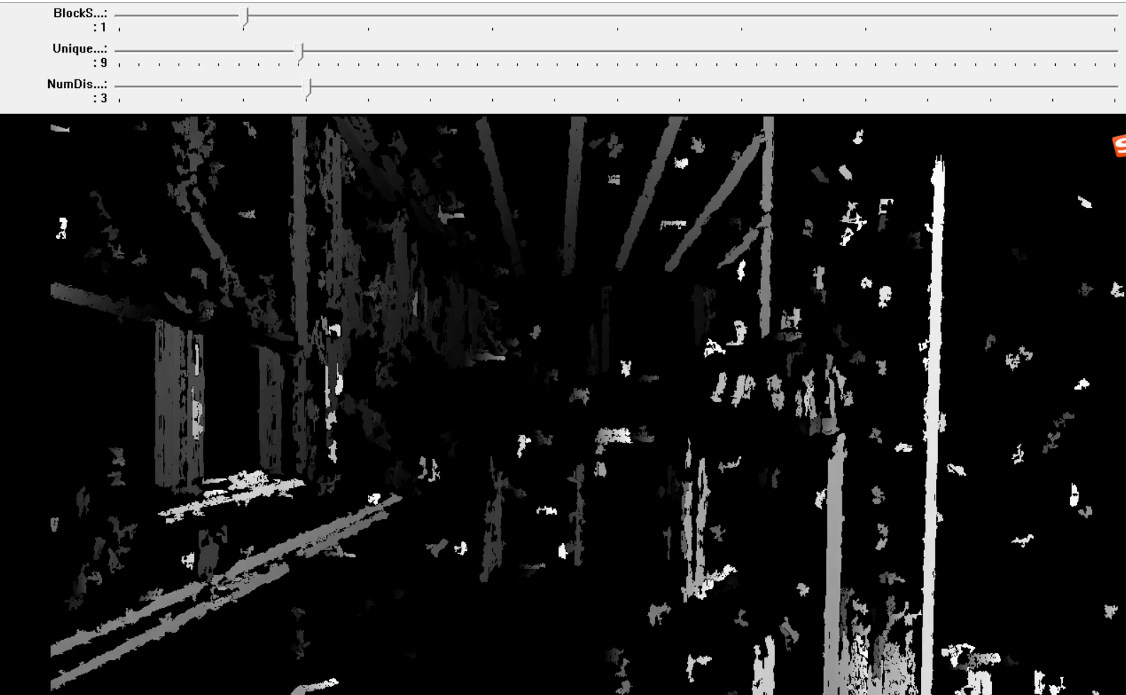 4.距离测定。通过拖动视差图上方三个滑动条可以调节blockSize(SAD窗口大小),numDisparities(视差窗口)和uniquenessRatio(唯一性比率)三个参数的大小,以此来获得噪点较少的视差图,使深度信息更加精准。最终实现了高精度的双目测距。
